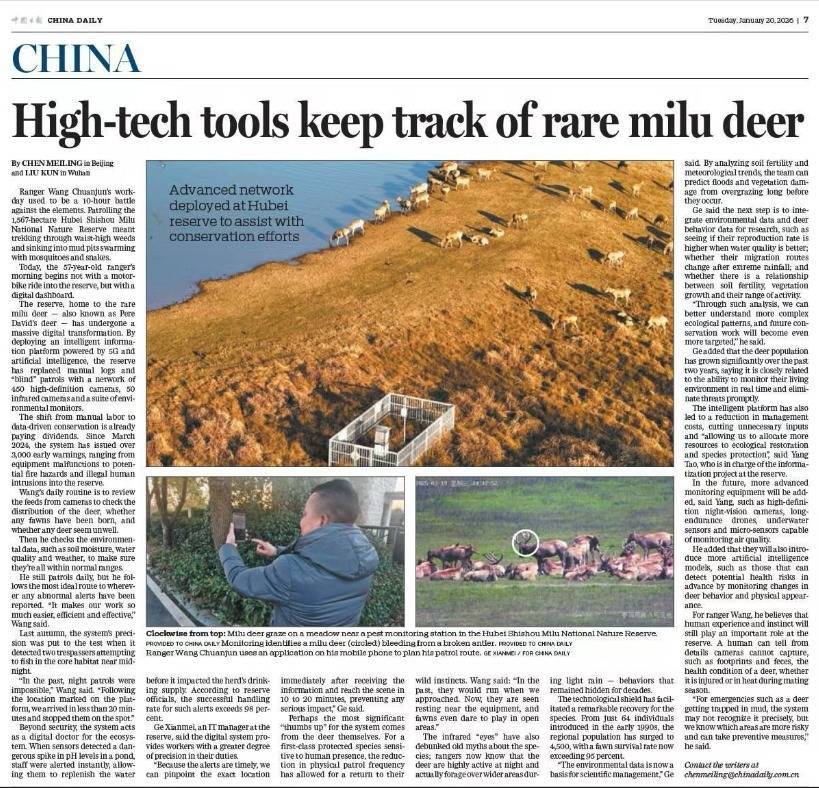湖北日报客户端讯(通讯员陈子阳)1月20日保利配资,中国日报以《高科技手段守护麋鹿家园》为题,向全球介绍了湖北石首麋鹿国家级自然保护区以智慧化建设赋能生态保护的创新实践。近年来,该保护区通过全面构建“天、地、空、人”一体化智能监测网络,实现了对珍稀麋鹿种群及其栖息环境的科学精准守护。