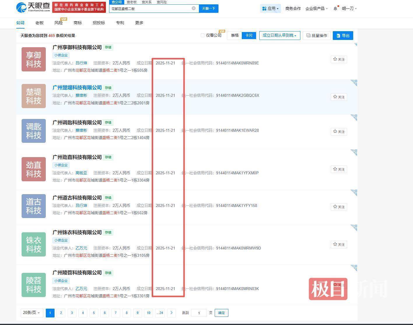 公开资料显示,合景保利香樾四季花园小区位于花都区花城街道盛杨二街。记者在企业信息查询平台搜索“盛杨二街”并限定在三个月内注册,看到有469家企业,这些企业绝大多数的注册资本为2万元,注册时间由2025年11月20日至12月21日,注册地址均为住宅地址。